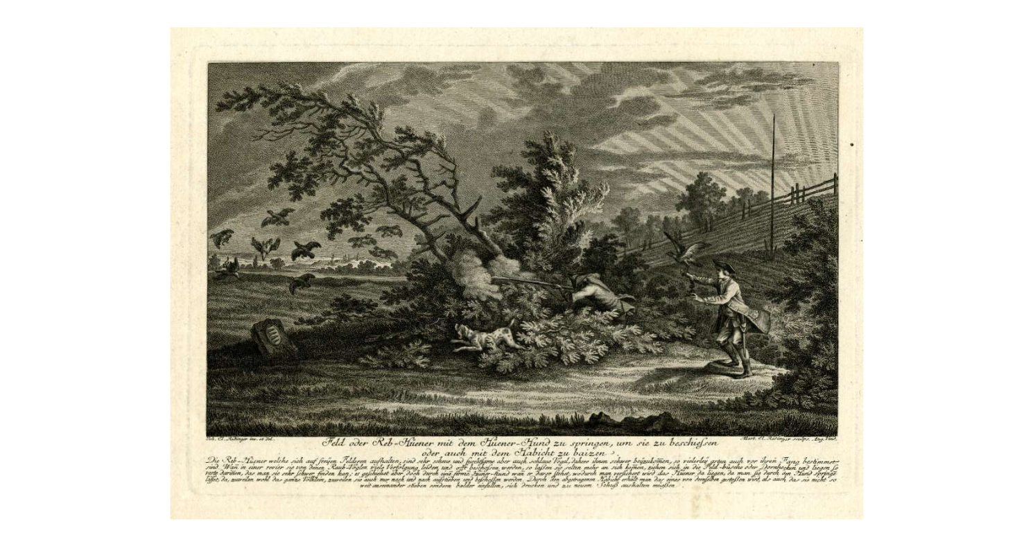 Landscape with a hunter taking aim at a flock of partridges at left, while his hound is about to c
