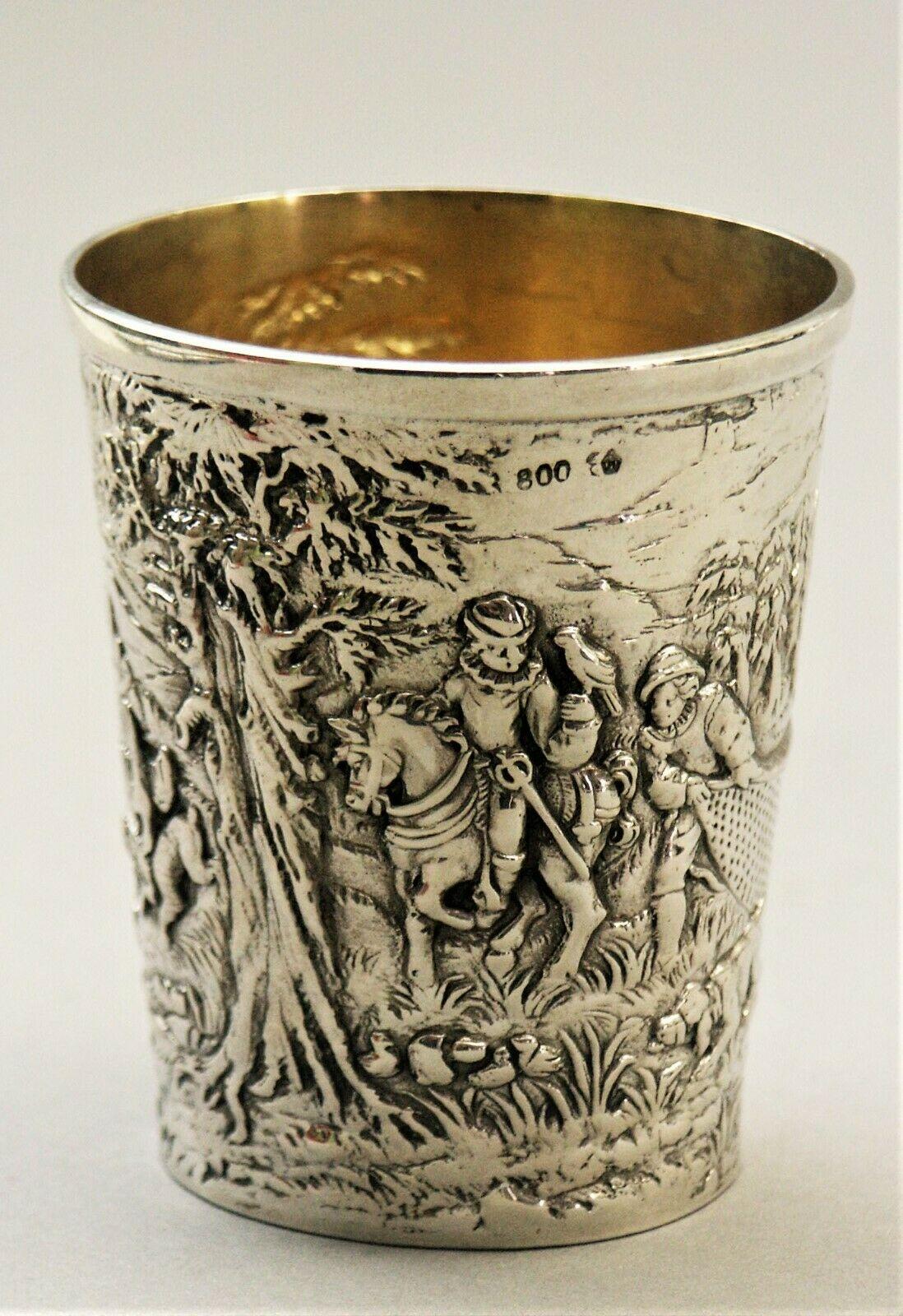 Silver mug with falconry scene [Jagd Becher 800er Silber 1 von 6 vergoldet Beizjagd Wein Pokal Falkn