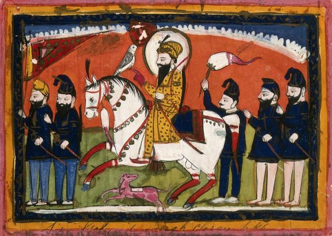 Sri Gobind Singh on horseback with his falcon and attendants.