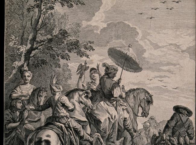 A hunting party with falcons. Engraving by S.F. Ravenet after Carle Vanloo.