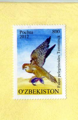 Uzbeki post stamp with a picture of Red-naped Shaheen Falco pelegrinoides Temminck