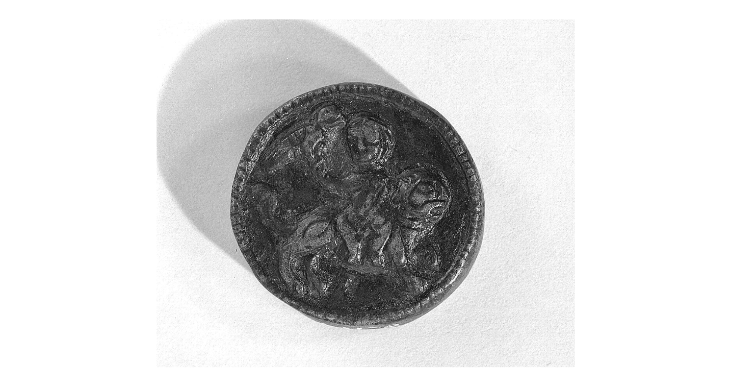 Weight. Circular with mounted falconer. Made of relief bronze.