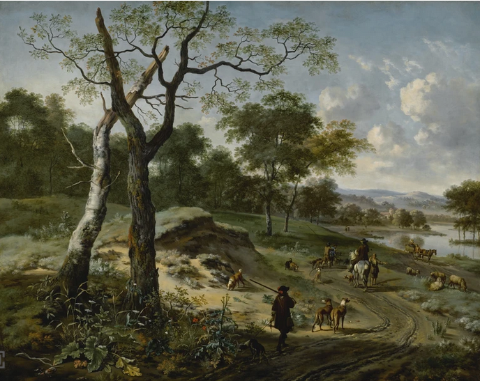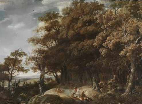 Wooded landscape with a hawking party by Jan Looten (1618-1681)