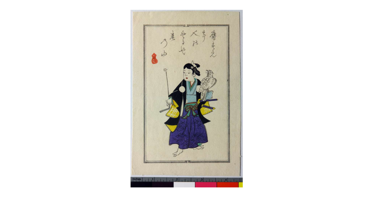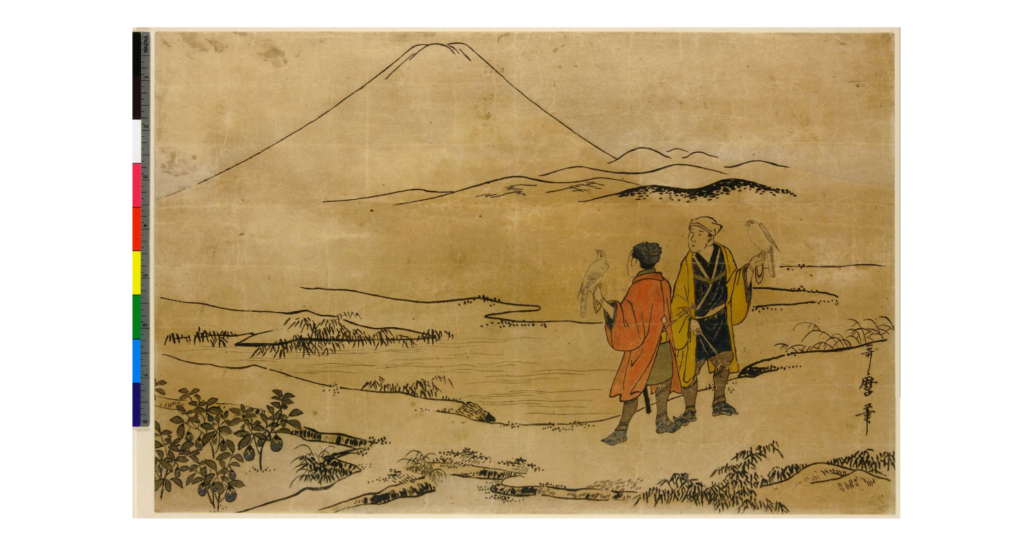 Woodblock print. Popular culture. Sport. Two falconers and Mount Fuji, egg-plants