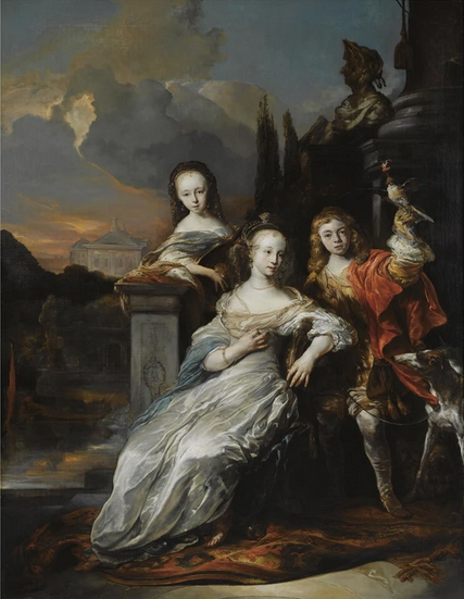 Young falconer with two sisters and a dog by Dutch artist Johannes van Noordt  (1624-1676)