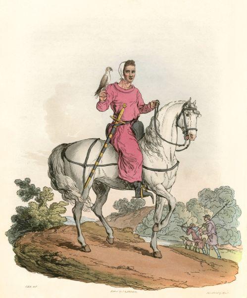 Young woman chasing a falcon and surrounded by her spaniels by A.C.Beeldemaker