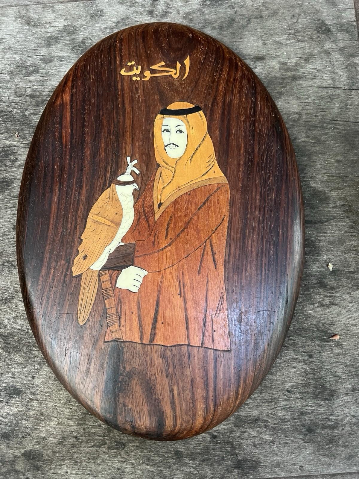 VINTAGE SAUDI ARABIA FALCONRY INLAID WOOD PLAQUE WALL DECOR FALCON 8"W X 11 3/4"